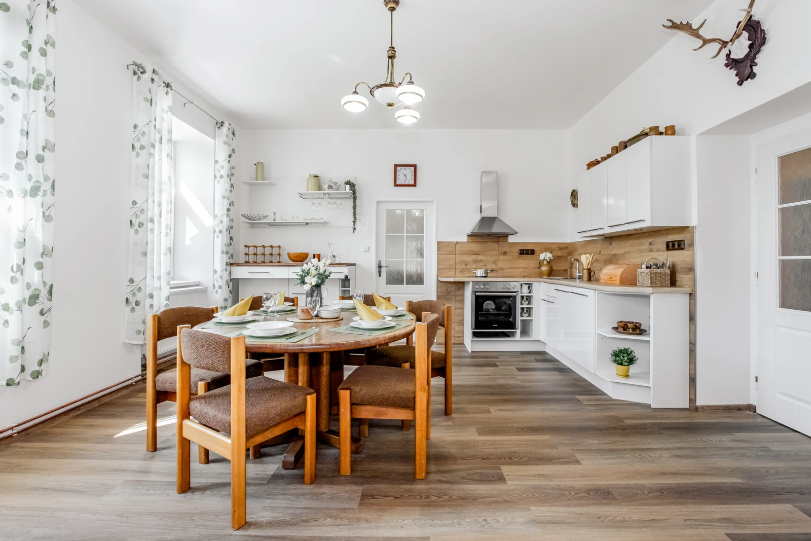 Plně vybavená kuchyň – lednice s mrazákem, varná deska, trouba, mikrovlnka, rychlovarná konvice, myčka nádobí, nádobí, topinkovač, univerzální kapslový kávovar (kompatibilní s kapslemi Nespresso Original, Dolce Gusto, Lavazza Blue; připravíte si v něm také nápoje z ESE podů či klasické mleté kávy). Kapsle nebo kávu si, prosíme, přivezte vlastní – takovou, jakou máte nejraději.